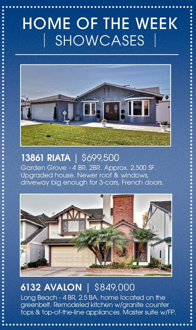 HOME OF THE WEEK | SHOWCASES | 13861 RIATA | $699,500 Garden Grove - 4 BR, 2BR. Approx. 2,500 SF. Upgraded house. Newer roof & windows, driveway big enough for 3-cars, French doors. 6132 AVALON | $849,000 Long Beach -4BR,2.5BA,home located on the greenbelt. Remodeled kitchen w/granite counter tops & top-of-the-line appliances. Master suite w/FP.