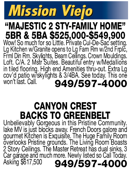 Mission Viejo “MAJESTIC 2 STY-FAMILY HOME” 5BR & 5BA $525,000-$549,900 Wow! So much for so Little. Private Cul-De-Sac setting. Lg Kitchen w/Granite opens to Lg Fam Rm w/2nd Frplc, Frml Din Rm. Skylights, Beam Ceilings. Crown Mouldings. Loft. C/A. 2 Mstr Suites. Beautiful entry w/Medallions in tiled flooring. High end Amenities thru-out. Extra Lg cov’d patio w/skylights & 3/4BA. See today. This one won’t last. Call. 949/597-4000 CANYON CREST BACKS TO GREENBELT Unbelievably Gorgeous in this Pristine Community. lake MV is just blocks away. French Doors galore and gourmet Kitchen is Exquisite. The Huge Family Room overlooks Pristine grounds. The Living Room Boasts 2 Story Ceilings. The Master Retreat has dual sinks, 3 Car garage and much more. Newly listed so Call Today. Asking $617,500 949/597-4000