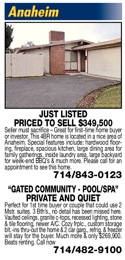 JUST LISTED PRICED TO SELL $349,500 Seller must sacrifice – Great for first-time home buyer or investor. This 4BR home is located in a nice area of Anaheim. Special features include: hardwood flooring, fireplace, spacious kitchen, large dining area for family gatherings, inside laundry area, large backyard for week-end BBQ’s & much more. Please call for an appointment to see this home.