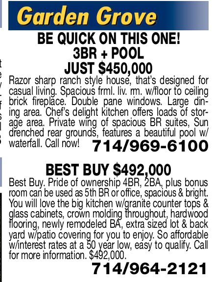 3BR + POOL JUST $450,000 Razor sharp ranch style house, that’s designed for casual living. Spacious frml. liv. rm. w/floor to ceiling brick fireplace. Double pane windows. Large dining area. Chef’s delight kitchen offers loads of storage area. Private wing of spacious BR suites, Sun drenched rear grounds, features a beautiful pool w/ waterfall. Call now! 714/969-6100