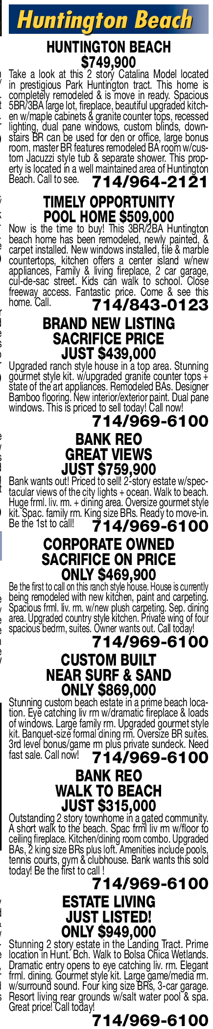714/969-6100 CUSTOM BUILT NEAR SURF & SAND ONLY $869,000 Stunning custom beach estate in a prime beach location. Eye catching liv rm w/dramatic fireplace & loads of windows. Large family rm. Upgraded gourmet style kit. Banquet-size formal dining rm. Oversize BR suites. 3rd level bonus/game rm plus private sundeck. Need fast sale. Call now! 714/969-6100
