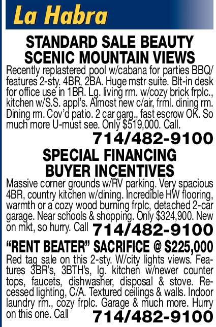 La Habra STANDARD SALE BEAUTY SCENIC MOUNTAIN VIEWS Recently replastered pool w/cabana for parties BBQ/ features 2-sty. 4BR, 2BA. Huge mstr suite. Blt-in desk for office use in 1BR. Lg. living rm. w/cozy brick frplc., kitchen w/S.S. appl’s. Almost new c/air, frml. dining rm. Dining rm. Cov’d patio. 2 car garg., fast escrow OK. So much more U-must see. Only $519,000. Call. 714/482-9100 SPECIAL FINANCING BUYER INCENTIVES Massive corner grounds w/RV parking. Very spacious 4BR, country kitchen w/dining. Incredible HW flooring, warmth or a cozy wood burning frplc, detached 2-car garage. Near schools & shopping. Only $324,900. New on mkt, so hurry. Call 714/482-9100 “RENT BEATER” SACRIFICE @ $225,000 Red tag sale on this 2-sty. W/city lights views. Features 3BR’s, 3BTH’s, lg. kitchen w/newer counter tops, faucets, dishwasher, disposal & stove. Recessed lighting, C/A. Textured ceilings & walls. Indoor laundry rm., cozy frplc. Garage & much more. Hurry on this one. Call 714/482-9100