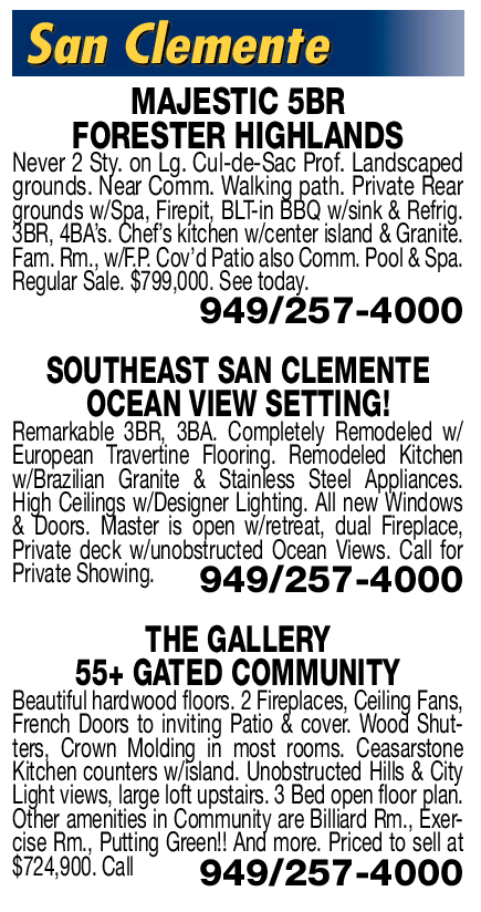 San Clemente MAJESTIC 5BR FORESTER HIGHLANDS Never 2 Sty. on Lg. Cul-de-Sac Prof. Landscaped grounds. Near Comm. Walking path. Private Rear grounds w/Spa, Firepit, BLT-in BBQ w/sink & Refrig. 3BR, 4BA’s. Chef’s kitchen w/center island & Granite. Fam. Rm., w/F.P. Cov’d Patio also Comm. Pool & Spa. Regular Sale. $799,000. See today. 949/257-4000 SOUTHEAST SAN CLEMENTE OCEAN VIEW SETTING! Remarkable 3BR, 3BA. Completely Remodeled w/ European Travertine Flooring. Remodeled Kitchen w/Brazilian Granite & Stainless Steel Appliances. High Ceilings w/Designer Lighting. All new Windows & Doors. Master is open w/retreat, dual Fireplace, Private deck w/unobstructed Ocean Views. Call for Private Showing. 949/257-4000 THE GALLERY 55+ GATED COMMUNITY Beautiful hardwood floors. 2 Fireplaces, Ceiling Fans, French Doors to inviting Patio & cover. Wood Shutters, Crown Molding in most rooms. Ceasarstone Kitchen counters w/island. Unobstructed Hills & City Light views, large loft upstairs. 3 Bed open floor plan. Other amenities in Community are Billiard Rm., Exercise Rm., Putting Green!! And more. Priced to sell at $724,900. Call 949/257-4000