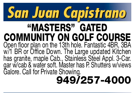San Juan Capistrano “MASTERS” GATED COMMUNITY ON GOLF COURSE Open floor plan on the 13th hole. Fantastic 4BR, 3BA w/1 BR or Office Down. The Large updated Kitchen has granite, maple Cab., Stainless Steel Appl. 3-Car. gar w/cab & water soft. Master has P. Shutters w/views Galore. Call for Private Showing. 949/257-4000