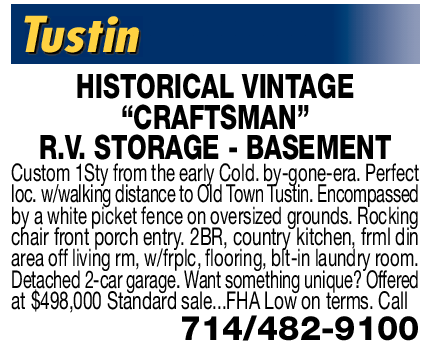 Tustin HISTORICAL VINTAGE “CRAFTSMAN” R.V. STORAGE - BASEMENT Custom 1Sty from the early Cold. by-gone-era. Perfect loc. w/walking distance to Old Town Tustin. Encompassed by a white picket fence on oversized grounds. Rocking chair front porch entry. 2BR, country kitchen, frml din area off living rm, w/frplc, flooring, blt-in laundry room. Detached 2-car garage. Want something unique? Offered at $498,000 Standard sale...FHA Low on terms. Call 714/482-9100