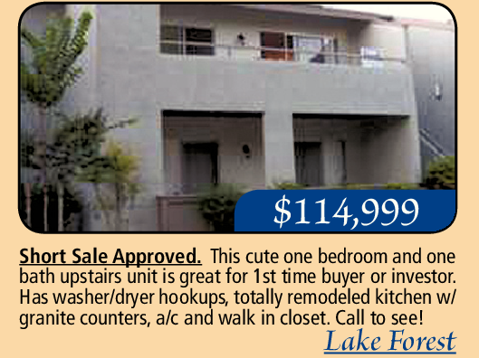 Short Sale Approved. This cute one bedroom and one bath upstairs unit is great for 1st time buyer or investor. Has washer/dryer hookups, totally remodeled kitchen w/ granite counters, a/c and walk in closet. Call to see! Lake Forest