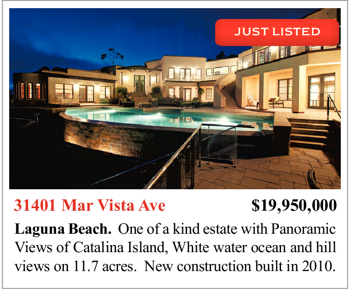31401 Mar Vista Ave $19,950,000 Laguna Beach. One of a kind estate with Panoramic Views of Catalina Island, White water ocean and hill views on 11.7 acres. New construction built in 2010.