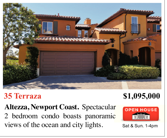35 Terraza $1,095,000 Altezza, Newport Coast. Spectacular 2 bedroom condo boasts panoramic views of the ocean and city lights.