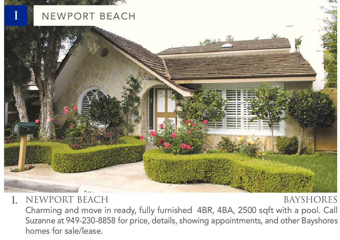NEWPORT BEACH BAYSHORES Charming and move in ready, fully furnished 4BR, 4BA, 2500 sqft with a pool. Call Suzanne at 949-230-8858 for price, details, showing appointments, and other Bayshores homes for sale/lease.