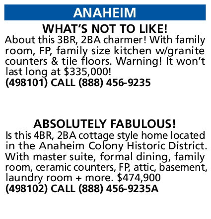 Is this 4BR, 2BA cottage style home located in the Anaheim Colony Historic District. With master suite, formal dining, family room, ceramic counters, FP, attic, basement, laundry room + more. $474,900 (498102) CALL (888) 456-9235A