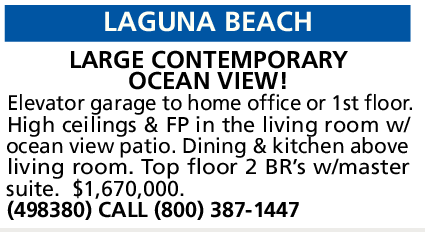 Elevator garage to home office or 1st floor. High ceilings & FP in the living room w/ ocean view patio. Dining & kitchen above living room. Top floor 2 BR’s w/master suite. $1,670,000.