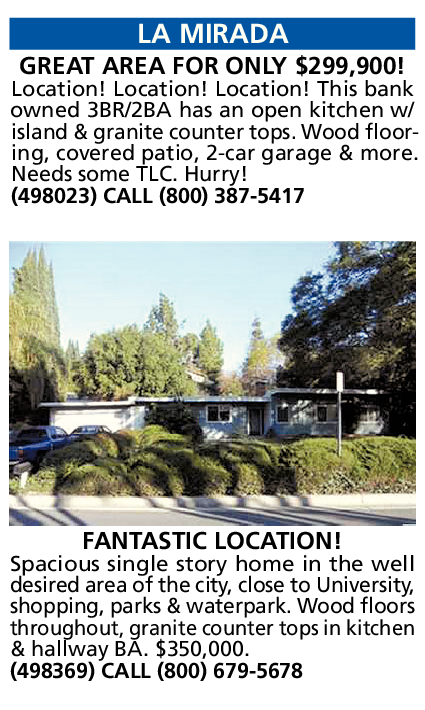 Location! Location! Location! This bank owned 3BR/2BA has an open kitchen w/ island & granite counter tops. Wood flooring, covered patio, 2-car garage & more.