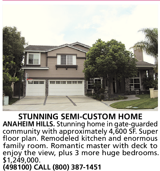 STUNNING SEMI-CUSTOM HOME ANAHEIM HILLS. Stunning home in gate-guarded community with approximately 4,600 SF. Super floor plan. Remodeled kitchen and enormous family room. Romantic master with deck to enjoy the view, plus 3 more huge bedrooms. $1,249,000. (498100) CALL (800) 387-1451