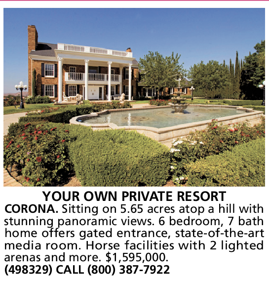 YOUR OWN PRIVATE RESORT CORONA. Sitting on 5.65 acres atop a hill with stunning panoramic views. 6 bedroom, 7 bath home offers gated entrance, state-of-the-art media room. Horse facilities with 2 lighted arenas and more. $1,595,000. (498329) CALL (800) 387-7922