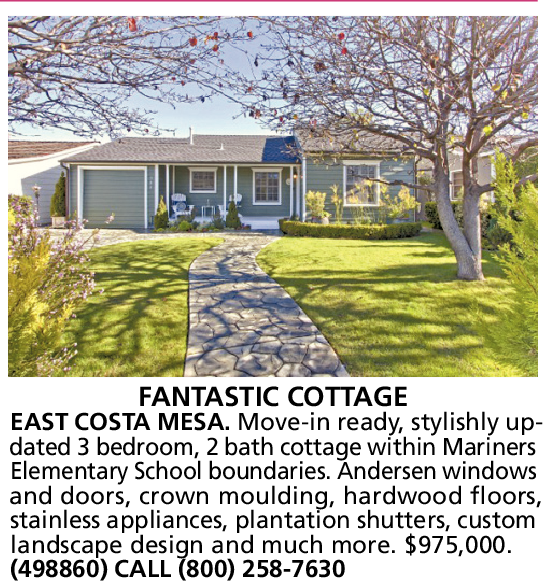 FANTASTIC COTTAGE EAST COSTA MESA. Move-in ready, stylishly updated 3 bedroom, 2 bath cottage within Mariners Elementary School boundaries. Andersen windows and doors, crown moulding, hardwood floors, stainless appliances, plantation shutters, custom landscape design and much more. $975,000. (498860) CALL (800) 258-7630