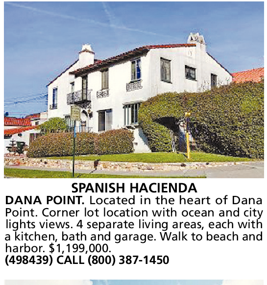 SPANISH HACIENDA DANA POINT. Located in the heart of Dana Point. Corner lot location with ocean and city lights views. 4 separate living areas, each with a kitchen, bath and garage. Walk to beach and harbor. $1,199,000. (498439) CALL (800) 387-1450