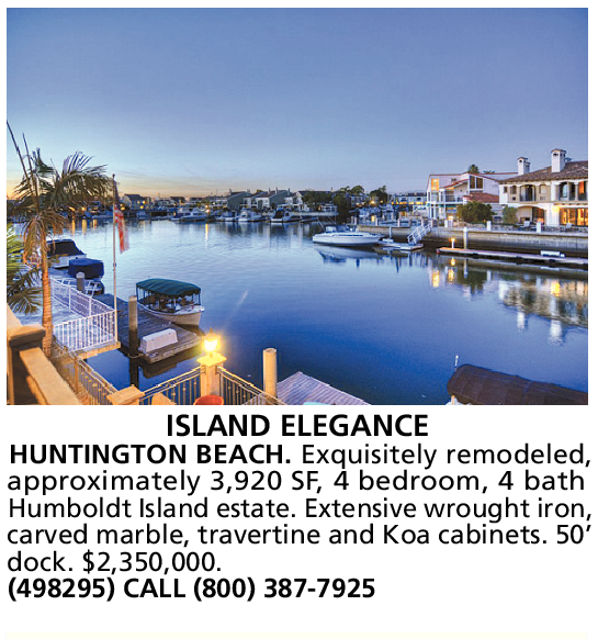 ISLAND ELEGANCE HUNTINGTON BEACH. Exquisitely remodeled, approximately 3,920 SF, 4 bedroom, 4 bath Humboldt Island estate. Extensive wrought iron, carved marble, travertine and Koa cabinets. 50’ dock. $2,350,000. (498295) CALL (800) 387-7925