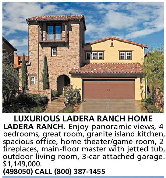 LUXURIOUS LADERA RANCH HOME LADERA RANCH. Enjoy panoramic views, 4 bedrooms, great room, granite island kitchen, spacious office, home theater/game room, 2 fireplaces, main-floor master with jetted tub, outdoor living room, 3-car attached garage. $1,149,000.