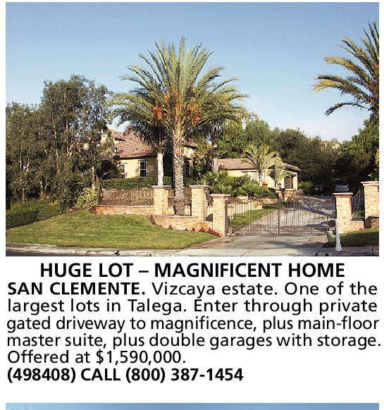 HUGE LOT – MAGNIFICENT HOME SAN CLEMENTE. Vizcaya estate. One of the largest lots in Talega. Enter through private gated driveway to magnificence, plus main-floor master suite, plus double garages with storage.