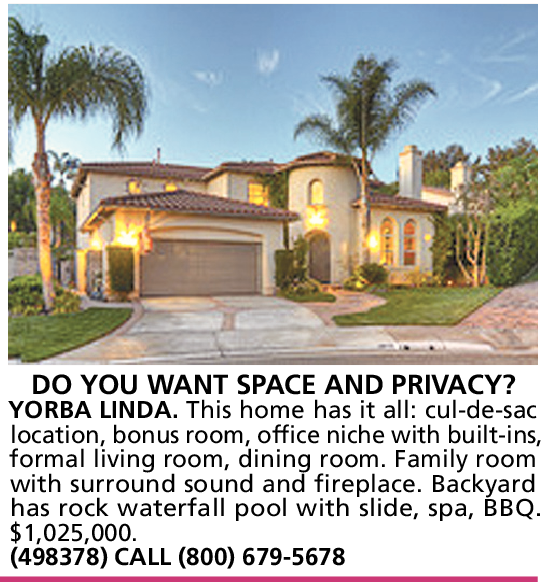 YORBA LINDA. This home has it all: cul-de-sac location, bonus room, office niche with built-ins, formal living room, dining room. Family room with surround sound and fireplace. Backyard has rock waterfall pool with slide, spa, BBQ.