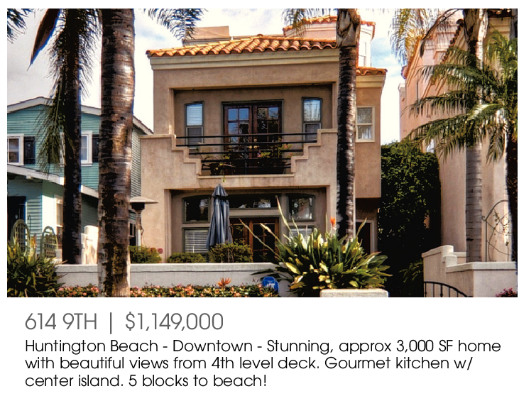 614 9TH | $1,149,000 Huntington Beach - Downtown - Stunning, approx 3,000 SF home with beautiful views from 4th level deck. Gourmet kitchen w/ center island. 5 blocks to beach!