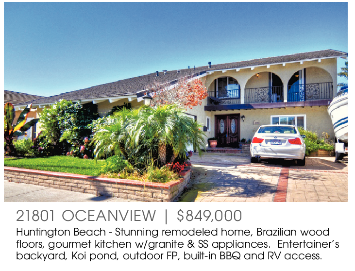 21801 OCEANVIEW | $849,000 Huntington Beach - Stunning remodeled home, Brazilian wood floors, gourmet kitchen w/granite & SS appliances. Entertainer’s backyard, Koi pond, outdoor FP, built-in BBQ and RV access.