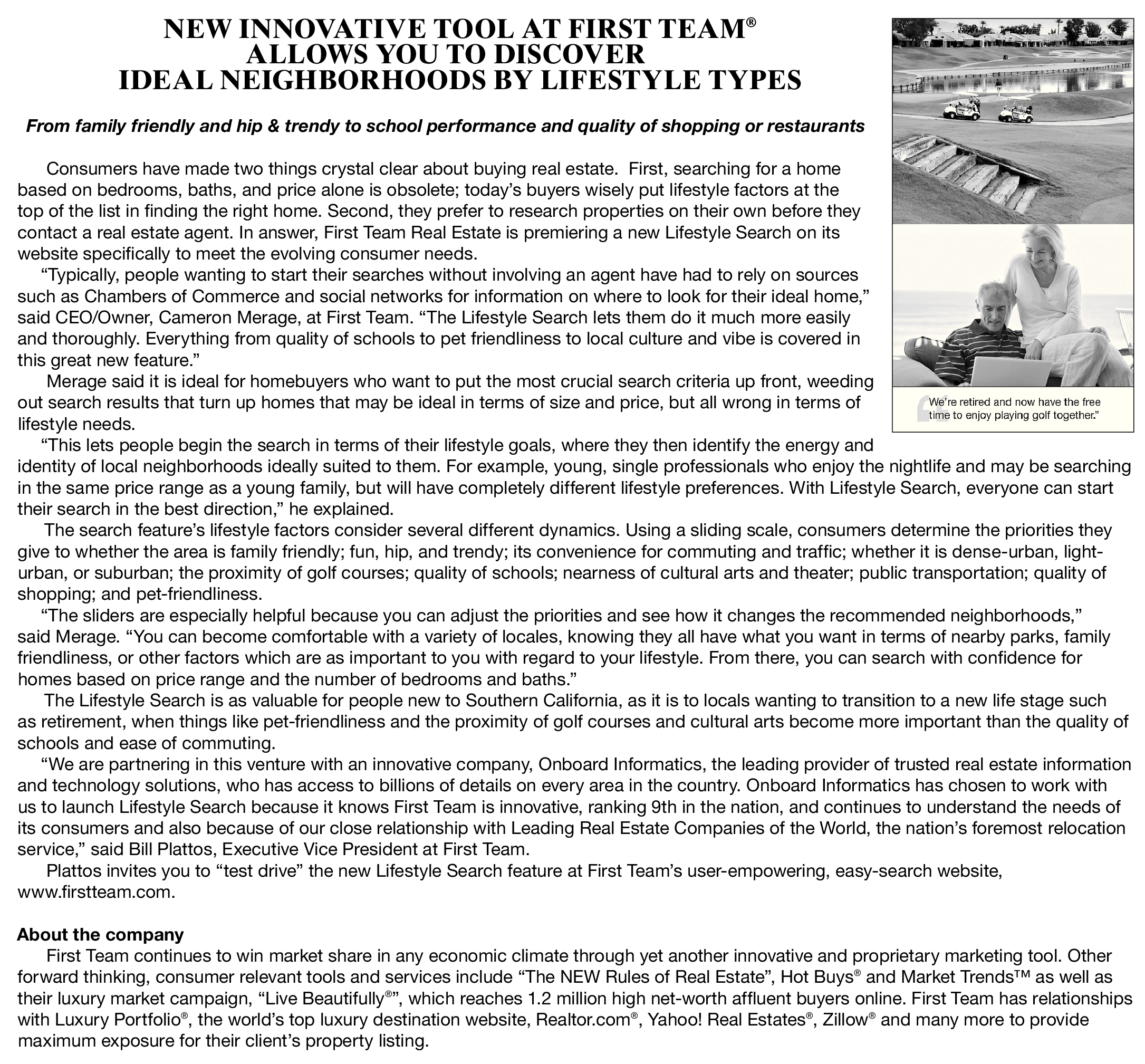 “We are partnering in this venture with an innovative company, Onboard Informatics, the leading provider of trusted real estate information and technology solutions, who has access to billions of details on every area in the country. Onboard Informatics has chosen to work with us to launch Lifestyle Search because it knows First Team is innovative, ranking 9th in the nation, and continues to understand the needs of its consumers and also because of our close relationship with Leading Real Estate Companies of the World, the nation’s foremost relocation service,” said Bill Plattos, Executive Vice President at First Team.