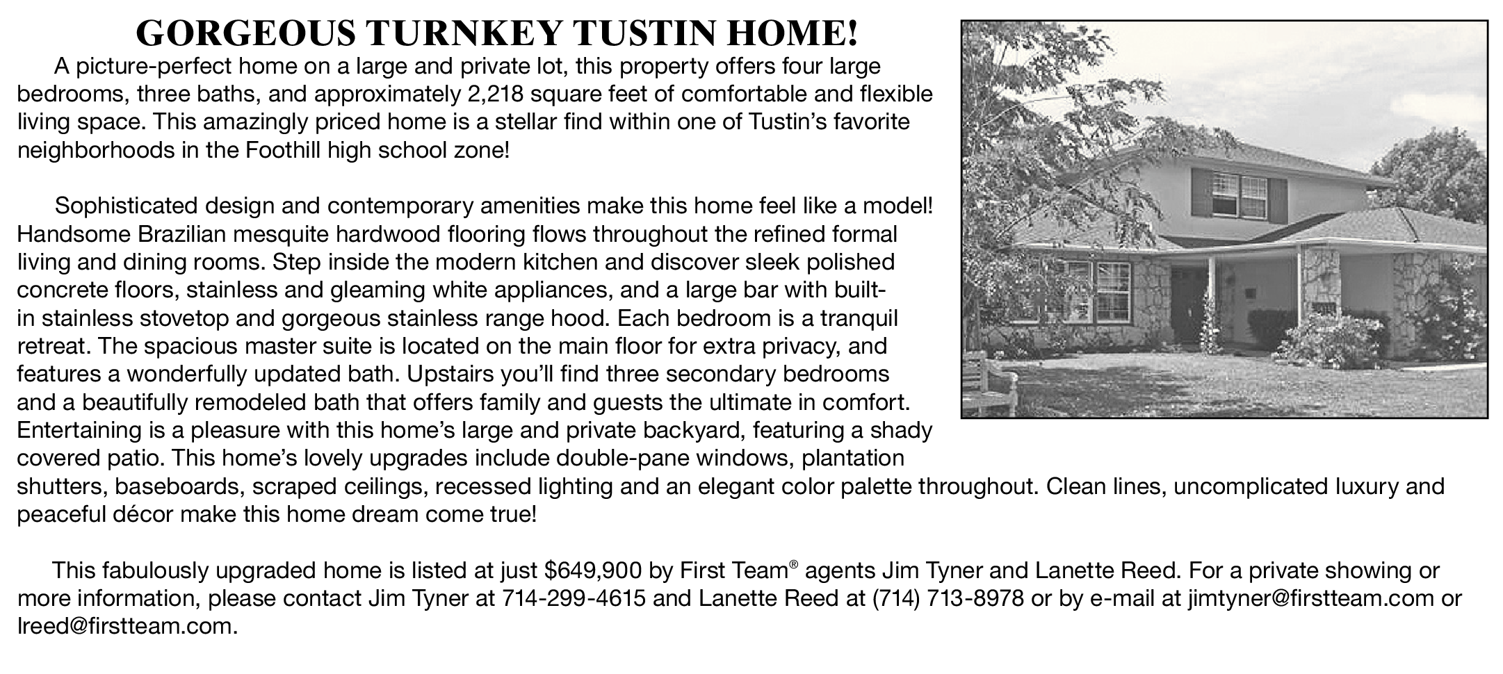 GORGEOUS TURNKEY TUSTIN HOME! A picture-perfect home on a large and private lot, this property offers four large bedrooms, three baths, and approximately 2,218 square feet of comfortable and fl exible living space. This amazingly priced home is a stellar find within one of Tustin’s favorite neighborhoods in the Foothill high school zone! Sophisticated design and contemporary amenities make this home feel like a model! Handsome Brazilian mesquite hardwood flooring flows throughout the refined formal living and dining rooms. Step inside the modern kitchen and discover sleek polished concrete floors, stainless and gleaming white appliances, and a large bar with builtin stainless stovetop and gorgeous stainless range hood. Each bedroom is a tranquil retreat. The spacious master suite is located on the main floor for extra privacy, and features a wonderfully updated bath. Upstairs you’ll find three secondary bedrooms and a beautifully remodeled bath that offers family and guests the ultimate in comfort. Entertaining is a pleasure with this home’s large and private backyard, featuring a shady covered patio. This home’s lovely upgrades include double-pane windows, plantation shutters, baseboards, scraped ceilings, recessed lighting and an elegant color palette throughout. Clean lines, uncomplicated luxury and peaceful décor make this home dream come true! This fabulously upgraded home is listed at just $649,900 by First Team ® agents Jim Tyner and Lanette Reed. For a private showing or more information, please contact Jim Tyner at 714-299-4615 and Lanette Reed at (714) 713-8978 or by e-mail at jimtyner@firstteam.com or lreed@firstteam.com.