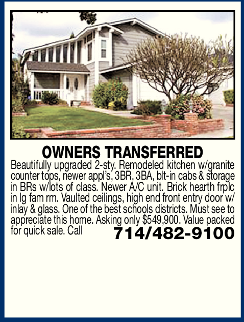 OWNERS TRANSFERRED Beautifully upgraded 2-sty. Remodeled kitchen w/granite counter tops, newer appl’s, 3BR, 3BA, blt-in cabs & storage in BRs w/lots of class. Newer A/C unit. Brick hearth frplc in lg fam rm. Vaulted ceilings, high end front entry door w/ inlay & glass. One of the best schools districts. Must see to appreciate this home. Asking only $549,900. Value packed for quick sale. Call 714/482-9100