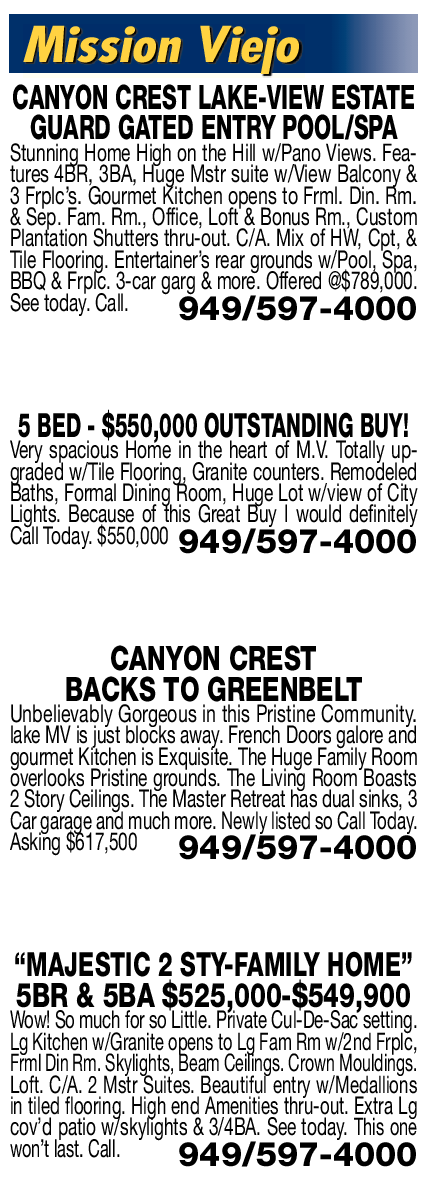 “MAJESTIC 2 STY-FAMILY HOME” 5BR & 5BA $525,000-$549,900 Wow! So much for so Little. Private Cul-De-Sac setting. Lg Kitchen w/Granite opens to Lg Fam Rm w/2nd Frplc, Frml Din Rm. Skylights, Beam Ceilings. Crown Mouldings. Loft. C/A. 2 Mstr Suites. Beautiful entry w/Medallions in tiled flooring. High end Amenities thru-out. Extra Lg cov’d patio w/skylights & 3/4BA. See today. This one won’t last. Call. 949/597-4000