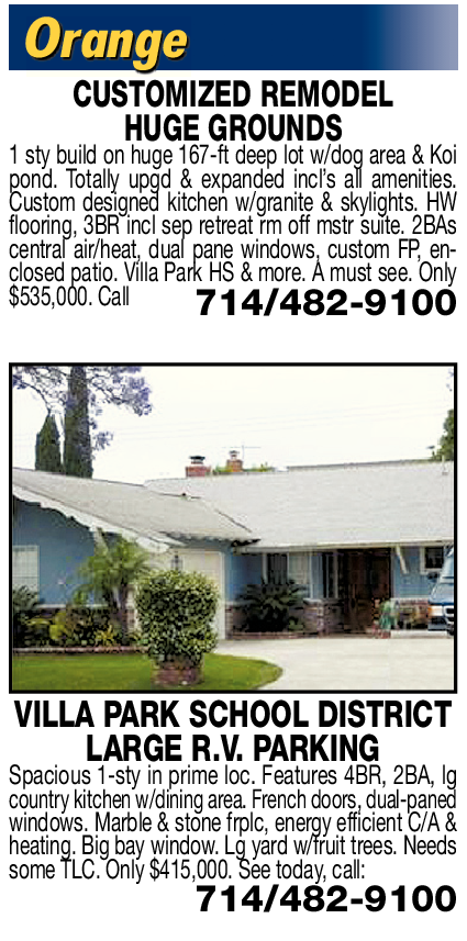 CUSTOMIZED REMODEL HUGE GROUNDS 1 sty build on huge 167-ft deep lot w/dog area & Koi pond. Totally upgd & expanded incl’s all amenities. Custom designed kitchen w/granite & skylights. HW flooring, 3BR incl sep retreat rm off mstr suite. 2BAs central air/heat, dual pane windows, custom FP, enclosed patio. Villa Park HS & more. A must see. Only $535,000. Call 714/482-9100