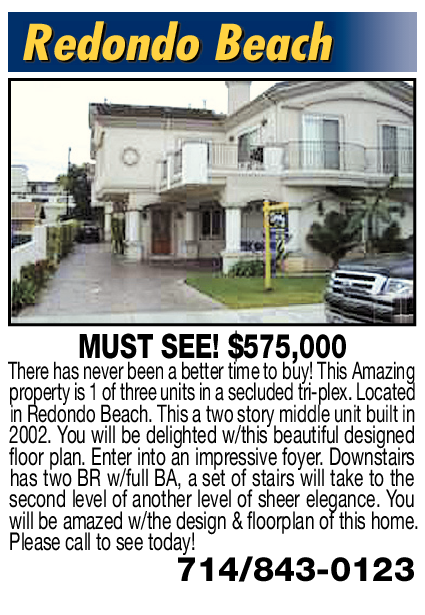 MUST SEE! $575,000 There has never been a better time to buy! This Amazing property is 1 of three units in a secluded tri-plex. Located in Redondo Beach. This a two story middle unit built in 2002. You will be delighted w/this beautiful designed floor plan. Enter into an impressive foyer. Downstairs has two BR w/full BA, a set of stairs will take to the second level of another level of sheer elegance. You will be amazed w/the design & floorplan of this home. Please call to see today!