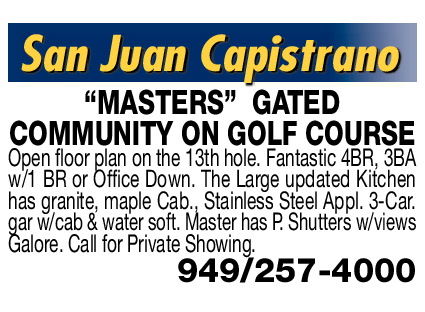 San Juan Capistrano “MASTERS” GATED COMMUNITY ON GOLF COURSE Open floor plan on the 13th hole. Fantastic 4BR, 3BA w/1 BR or Office Down. The Large updated Kitchen has granite, maple Cab., Stainless Steel Appl. 3-Car. gar w/cab & water soft. Master has P. Shutters w/views Galore. Call for Private Showing. 949/257-4000