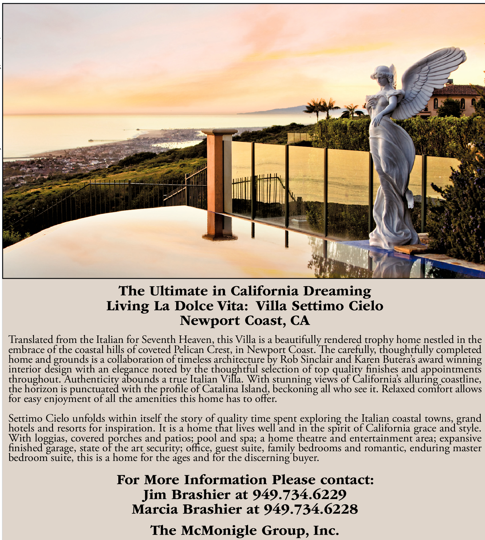 The Ultimate in California Dreaming Living La Dolce Vita: Villa Settimo Cielo Newport Coast, CA Translated from the Italian for Seventh Heaven, this Villa is a beautifully rendered trophy home nestled in the embrace of the coastal hills of coveted Pelican Crest, in Newport Coast. The carefully, thoughtfully completed home and grounds is a collaboration of timeless architecture by Rob Sinclair and Karen Butera’s award winning interior design with an elegance noted by the thoughtful selection of top quality finishes and appointments throughout. Authenticity abounds a true Italian Villa. With stunning views of California’s alluring coastline, the horizon is punctuated with the profile of Catalina Island, beckoning all who see it. Relaxed comfort allows for easy enjoyment of all the amenities this home has to offer. Settimo Cielo unfolds within itself the story of quality time spent exploring the Italian coastal towns, grand hotels and resorts for inspiration. It is a home that lives well and in the spirit of California grace and style. With loggias, covered porches and patios; pool and spa; a home theatre and entertainment area; expansive finished garage, state of the art security; office, guest suite, family bedrooms and romantic, enduring master bedroom suite, this is a home for the ages and for the discerning buyer. For More Information Please contact: Jim Brashier at 949.734.6229 Marcia Brashier at 949.734.6228 The McMonigle Group, Inc.