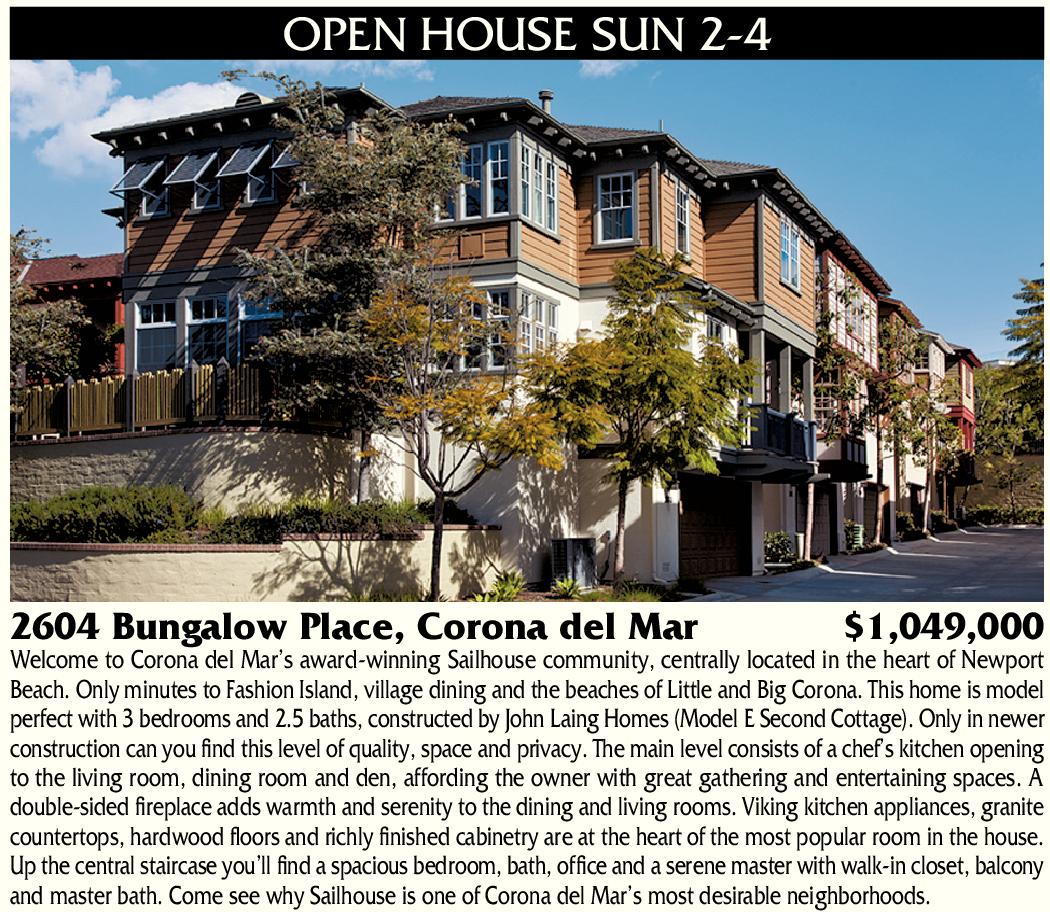 Welcome to Corona del Mar’s award-winning Sailhouse community, centrally located in the heart of Newport Beach. Only minutes to Fashion Island, village dining and the beaches of Little and Big Corona. This home is model perfect with 3 bedrooms and 2.5 baths, constructed by John Laing Homes (Model E Second Cottage). Only in newer construction can you find this level of quality, space and privacy. The main level consists of a chef’s kitchen opening to the living room, dining room and den, affording the owner with great gathering and entertaining spaces. A double-sided fireplace adds warmth and serenity to the dining and living rooms. Viking kitchen appliances, granite countertops, hardwood floors and richly finished cabinetry are at the heart of the most popular room in the house. Up the central staircase you’ll find a spacious bedroom, bath, office and a serene master with walk-in closet, balcony and master bath. Come see why Sailhouse is one of Corona del Mar’s most desirable neighborhoods.