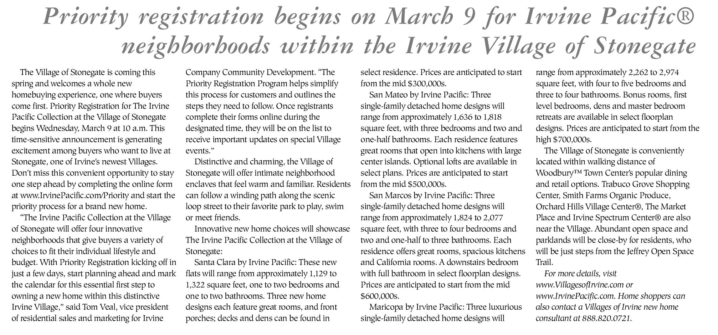 The Village of Stonegate is coming this spring and welcomes a whole new homebuying experience, one where buyers come first. Priority Registration for The Irvine Pacific Collection at the Village of Stonegate begins Wednesday, March 9 at 10 a.m. This time-sensitive announcement is generating excitement among buyers who want to live at Stonegate, one of Irvine’s newest Villages. Don’t miss this convenient opportunity to stay one step ahead by completing the online form at www.IrvinePacific.com/Priority and start the priority process for a brand new home.