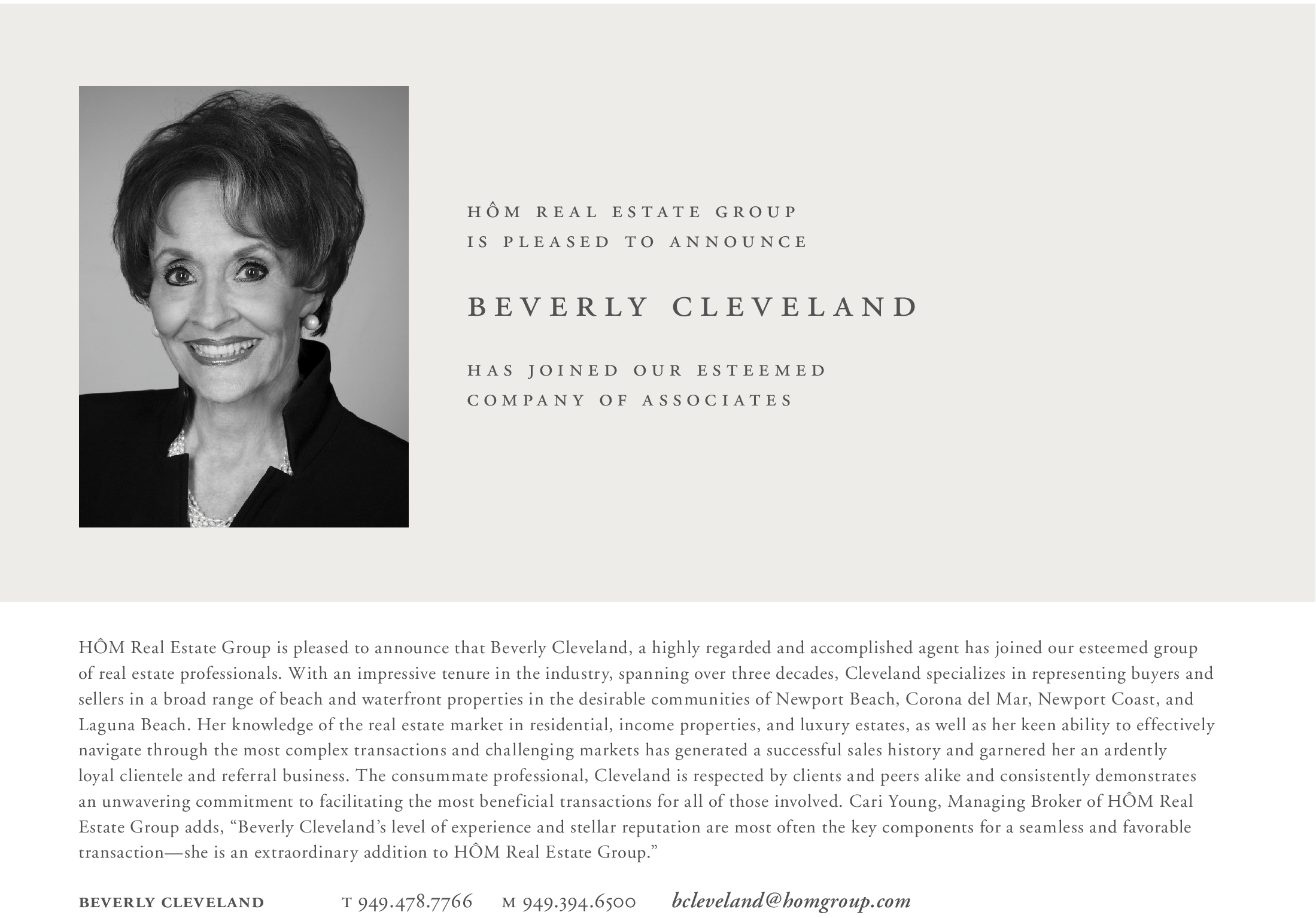 HÔM Real Estate Group is pleased to announce that Beverly Cleveland, a highly regarded and accomplished agent has joined our esteemed group of real estate professionals. With an impressive tenure in the industry, spanning over three decades, Cleveland specializes in representing buyers and sellers in a broad range of beach and waterfront properties in the desirable communities of Newport Beach, Corona del Mar, Newport Coast, and Laguna Beach. Her knowledge of the real estate market in residential, income properties, and luxury estates, as well as her keen ability to effectively navigate through the most complex transactions and challenging markets has generated a successful sales history and garnered her an ardently loyal clientele and referral business. The consummate professional, Cleveland is respected by clients and peers alike and consistently demonstrates an unwavering commitment to facilitating the most beneficial transactions for all of those involved. Cari Young, Managing Broker of HÔM Real Estate Group adds, “Beverly Cleveland’s level of experience and stellar reputation are most often the key components for a seamless and favorable transaction—she is an extraordinary addition to HÔM Real Estate Group.”