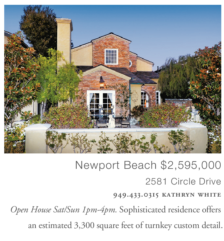 Newport Beach $2,595,000 2581 Circle Drive 949.433.0315 kathryn white Open House Sat/Sun 1pm-4pm. Sophisticated residence offers an estimated 3,300 square feet of turnkey custom detail.