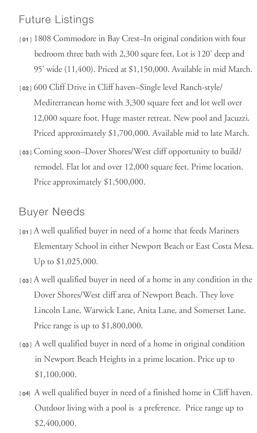 [ 03 ] A well qualified buyer in need of a home in any condition in the Dover Shores/West cliff area of Newport Beach. They love Lincoln Lane, Warwick Lane, Anita Lane, and Somerset Lane. Price range is up to $1,800,000.