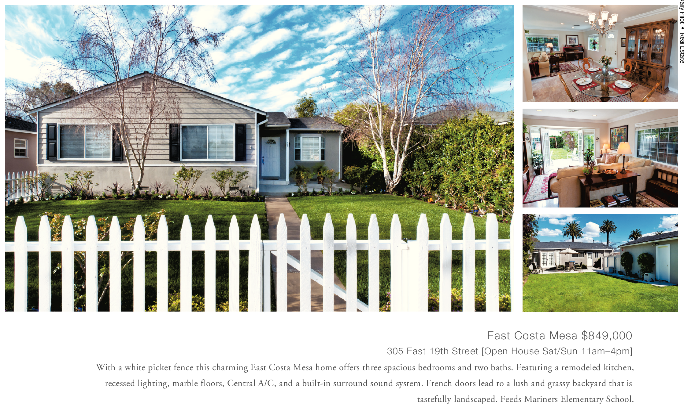 East Costa Mesa $849,000 305 East 19th Street [Open House Sat/Sun 11am–4pm] With a white picket fence this charming East Costa Mesa home offers three spacious bedrooms and two baths. Featuring a remodeled kitchen, recessed lighting, marble floors, Central A/C, and a built-in surround sound system. French doors lead to a lush and grassy backyard that is tastefully landscaped. Feeds Mariners Elementary School.