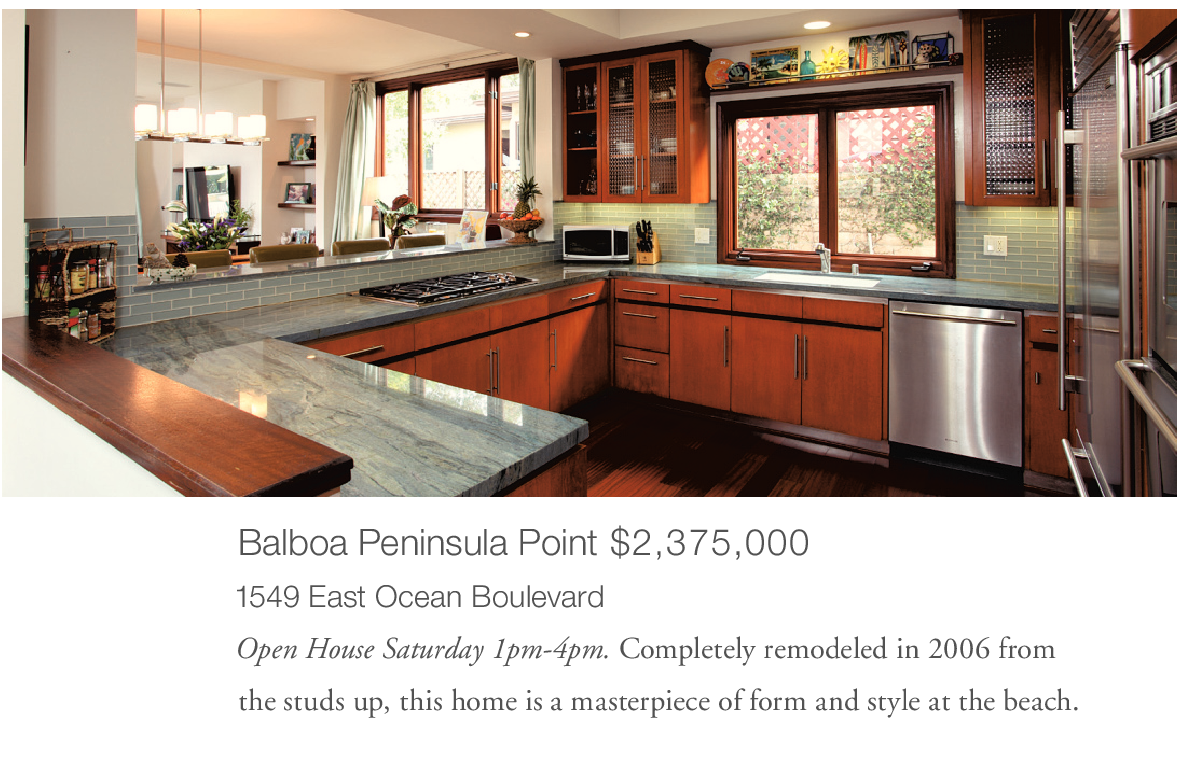 Balboa Peninsula Point $2,375,000 1549 East Ocean Boulevard Open House Saturday 1pm-4pm. Completely remodeled in 2006 from the studs up, this home is a masterpiece of form and style at the beach.