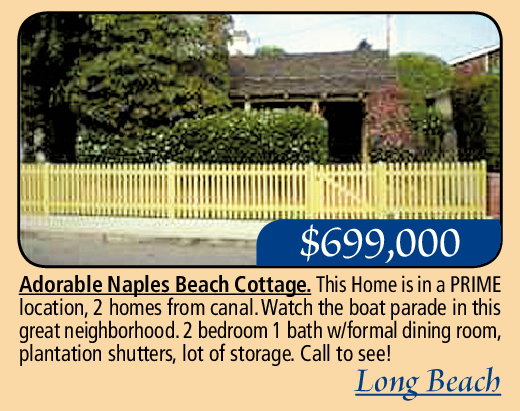 $699,000 Adorable Naples Beach Cottage. This Home is in a PRIME location, 2 homes from canal. Watch the boat parade in this great neighborhood. 2 bedroom 1 bath w/formal dining room, plantation shutters, lot of storage. Call to see! Long Beach See also