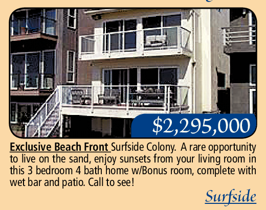 Exclusive Beach Front Surfside Colony. A rare opportunity to live on the sand, enjoy sunsets from your living room in this 3 bedroom 4 bath home w/Bonus room, complete with wet bar and patio. Call to see!