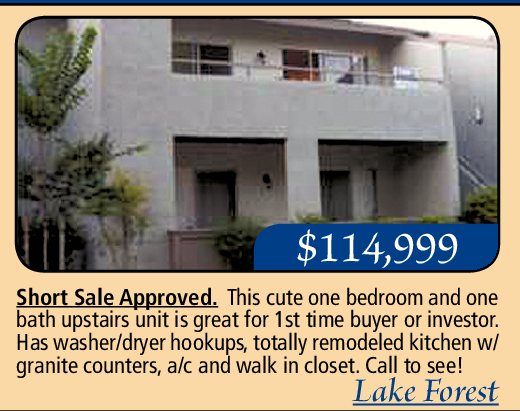 Short Sale Approved. This cute one bedroom and one bath upstairs unit is great for 1st time buyer or investor. Has washer/dryer hookups, totally remodeled kitchen w/ granite counters, a/c and walk in closet. Call to see! Lake Forest