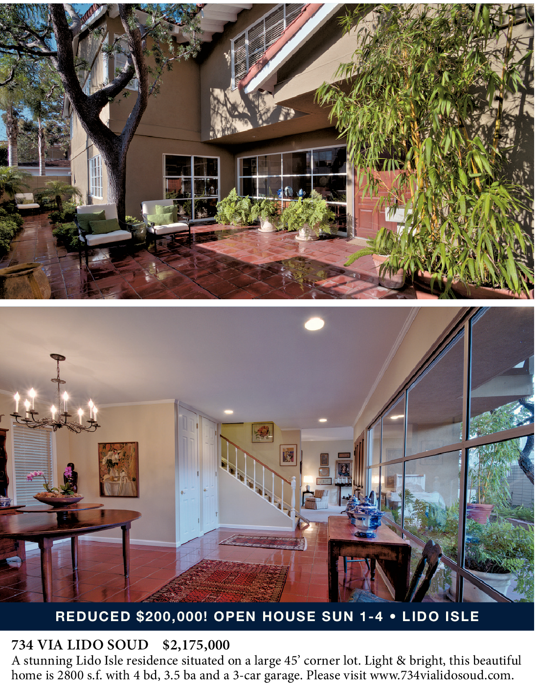 REDUCED $200,000! OPEN HOUSE SUN 1-4 • LIDO ISLE 734 VIA LIDO SOUD $2,175,000 A stunning Lido Isle residence situated on a large 45’ corner lot. Light & bright, this beautiful home is 2800 s.f. with 4 bd, 3.5 ba and a 3-car garage. Please visit www.734vialidosoud.com.