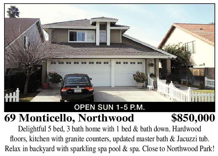 69 Monticello, Northwood $850,000 Delightful 5 bed, 3 bath home with 1 bed & bath down. Hardwood floors, kitchen with granite counters, updated master bath & Jacuzzi tub. Relax in backyard with sparkling spa pool & spa. Close to Northwood Park! OPEN SUN 1-5 P.M.