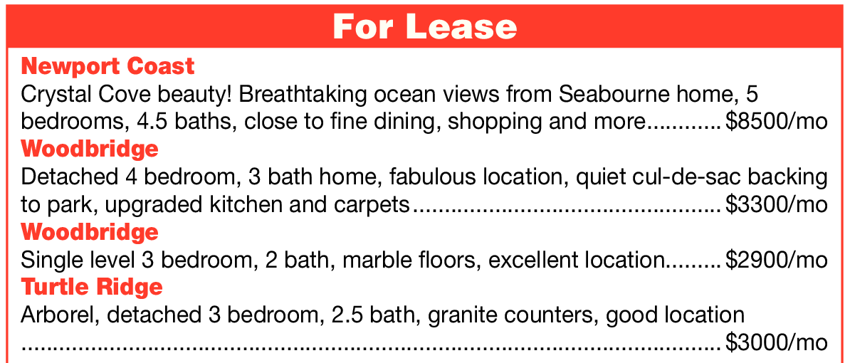 For Lease Newport Coast Crystal Cove beauty! Breathtaking ocean views from Seabourne home, 5 bedrooms, 4.5 baths, close to fine dining, shopping and more ............ $8500/mo Woodbridge Detached 4 bedroom, 3 bath home, fabulous location, quiet cul-de-sac backing to park, upgraded kitchen and carpets ................................................. $3300/mo Woodbridge Single level 3 bedroom, 2 bath, marble floors, excellent location......... $2900/mo Turtle Ridge Arborel, detached 3 bedroom, 2.5 bath, granite counters, good location ............................................................................................................... $3000/mo