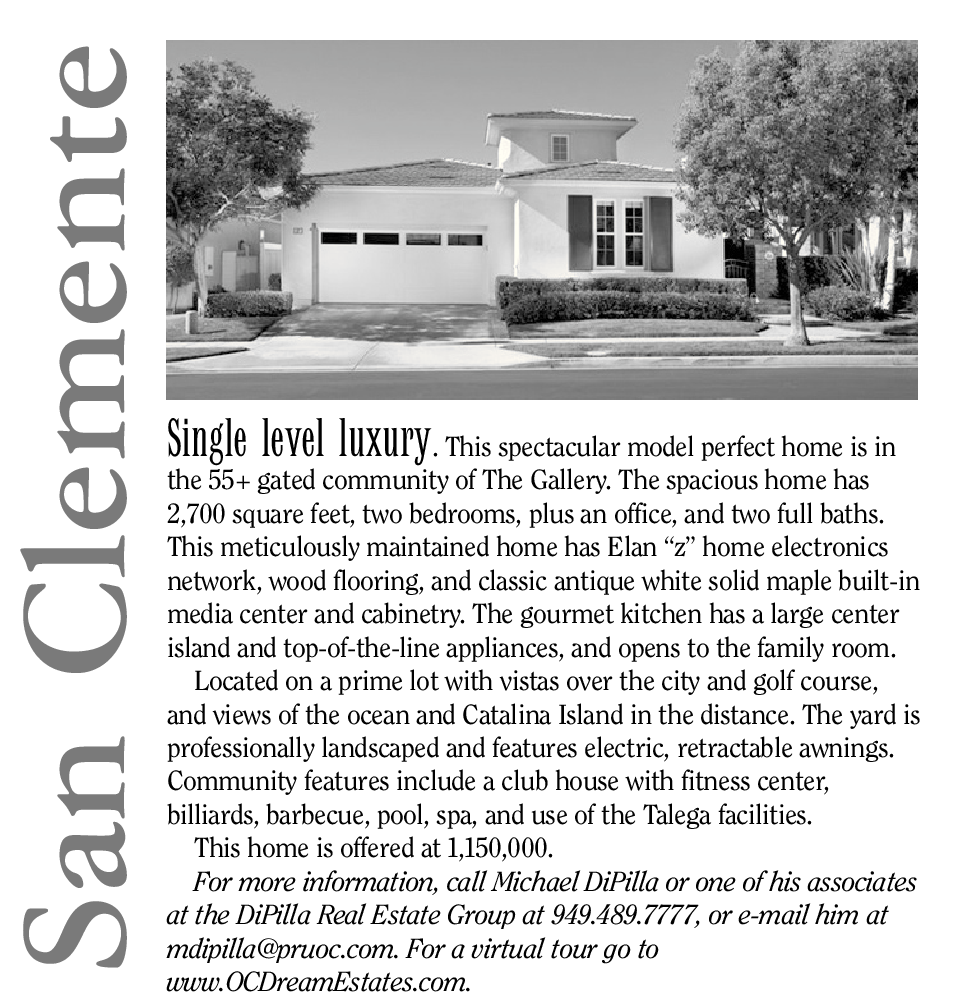 Single level luxury. This spectacular model perfect home is in the 55+ gated community of The Gallery. The spacious home has 2,700 square feet, two bedrooms, plus an office, and two full baths. This meticulously maintained home has Elan “z” home electronics network, wood flooring, and classic antique white solid maple built-in media center and cabinetry. The gourmet kitchen has a large center island and top-of-the-line appliances, and opens to the family room. Located on a prime lot with vistas over the city and golf course, and views of the ocean and Catalina Island in the distance. The yard is professionally landscaped and features electric, retractable awnings. Community features include a club house with fitness center, billiards, barbecue, pool, spa, and use of the Talega facilities. This home is offered at 1,150,000. For more information, call Michael DiPilla or one of his associates at the DiPilla Real Estate Group at 949.489.7777, or e-mail him at mdipilla@pruoc.com. For a virtual tour go to www.OCDreamEstates.com.