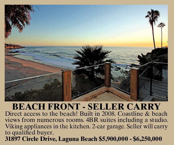 BEACH FRONT - SELLER CARRY Direct access to the beach! Built in 2008. Coastline & beach views from numerous rooms. 4BR suites including a studio. Viking appliances in the kitchen. 2-car garage. Seller will carry to qualified buyer. 31897 Circle Drive, Laguna Beach $5,900,000 - $6,250,000