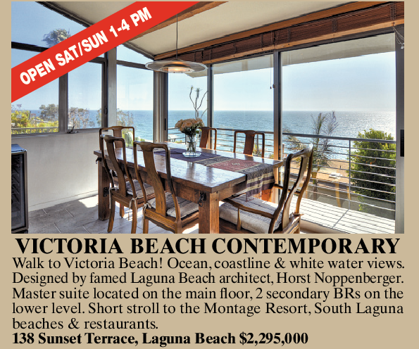 VICTORIA BEACH CONTEMPORARY Walk to Victoria Beach! Ocean, coastline & white water views. Designed by famed Laguna Beach architect, Horst Noppenberger. Master suite located on the main floor, 2 secondary BRs on the lower level. Short stroll to the Montage Resort, South Laguna beaches & restaurants. 138 Sunset Terrace, Laguna Beach $2,295,000
